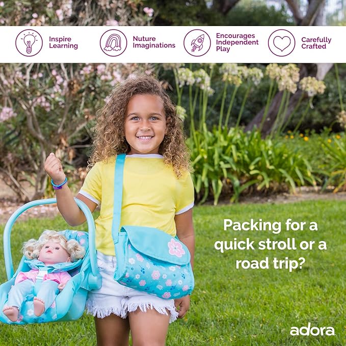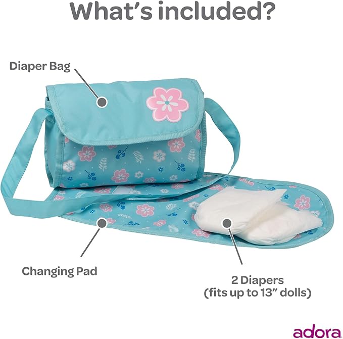 ADORA Baby Doll Diaper Bag with Sturdy Straps, Includes Changing Mat and 2 Doll Diapers (Fits 13" Dolls), Birthday Gift for Ages 3+ - Blue Flower Power