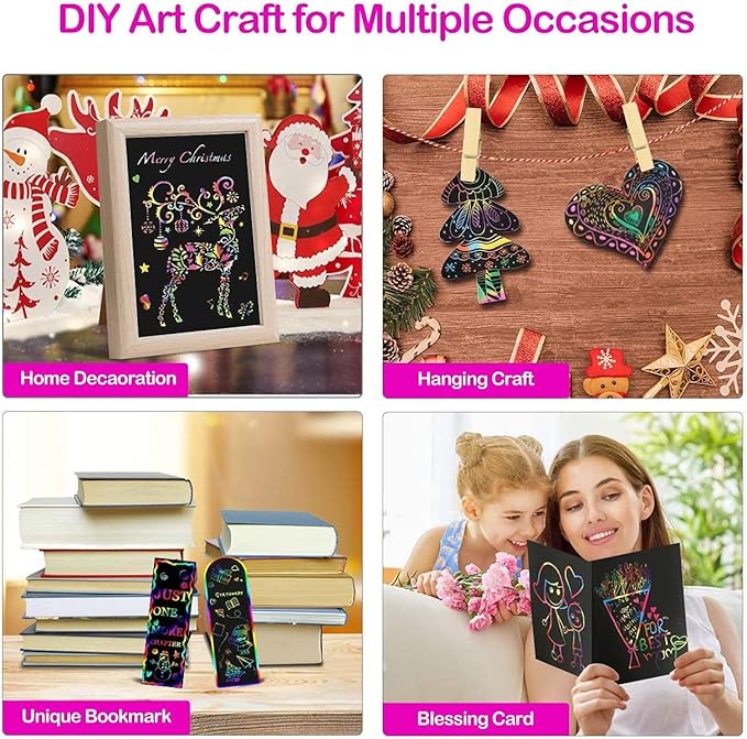 - Fun & Creative for DIY: Kids arts crafts use for multiple purposes, doodle, jot notes, create cards, sketch, draw, trace and more. Cut out your beautiful designs with this magic scratch art as Christmas stocking stuffers for kids, bookmarks, gift tags, hanging decorations, scrapbooks and other scratch crafts projects, Rainbow paper craft kit can improve your drawing, imagination and creativity skills, add more fun for you