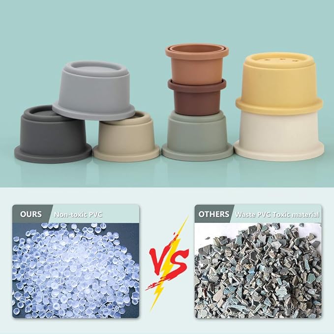 - 【Excellent Material】The stacking cups are made of high quality plastic material.No bad smell or any sharp edges and corners.The exterior is covered with high-quality feel paint.Very smooth surface that is safety for all ages babies.