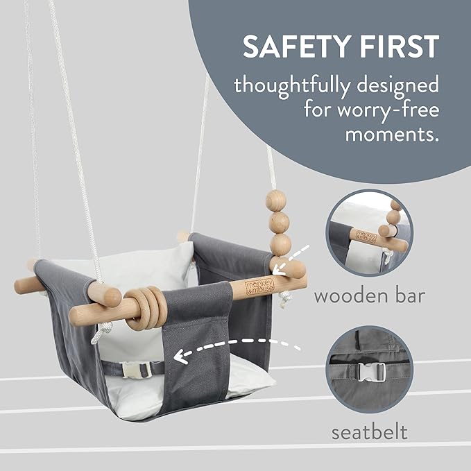 - PREMIUM CONSTRUCTION: This adorable baby swing uses durable cotton canvas over a sturdy beech wood frame for reliable for indoor & outdoor use. The wooden toy attachments promote sensory development and will entertain infants & toddlers for hours