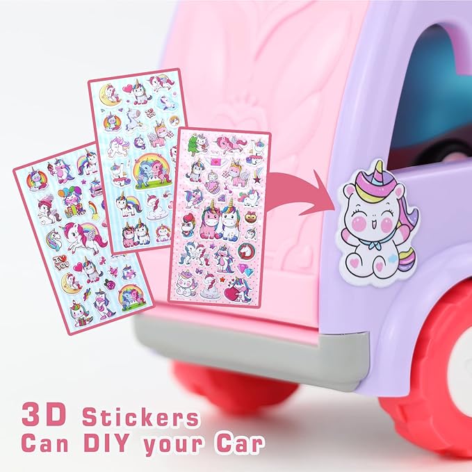 - 【7 in 1 Unicorn Toy Girl Car】- The carrier trucks car set include 1 big cartoon unicorn truck, 6 mini different color animal cars and 3 unicorn 3D stickers.Rich color matching and cute cartoon expressions bring more fun to the vehicle play set.