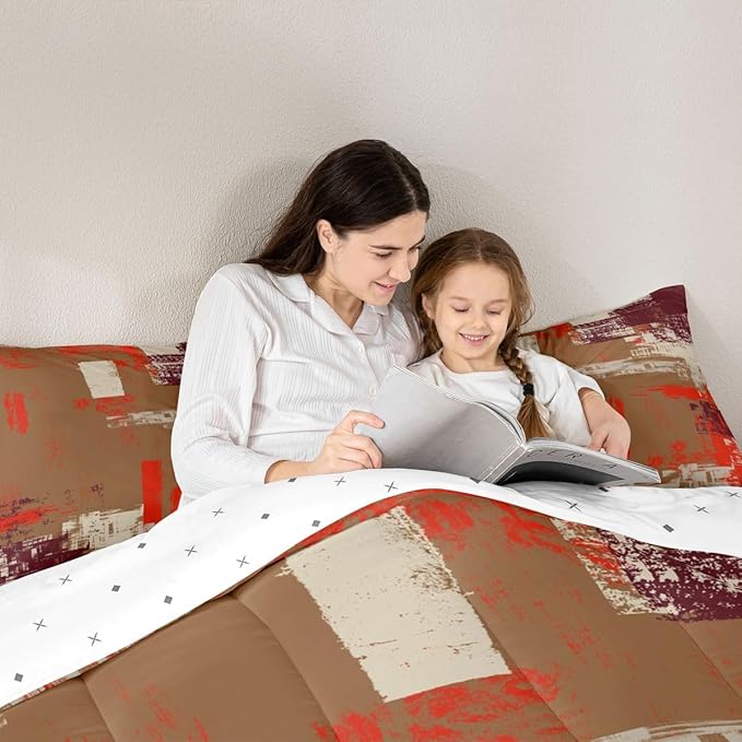 Feelyou Abstract Bedding Set Kids Modern Abstract Art Comforter Set Brown Orange Comforter for Boys Room Decor Lightweight Retro Duvet Set Queen Size with 2 Pillow Case