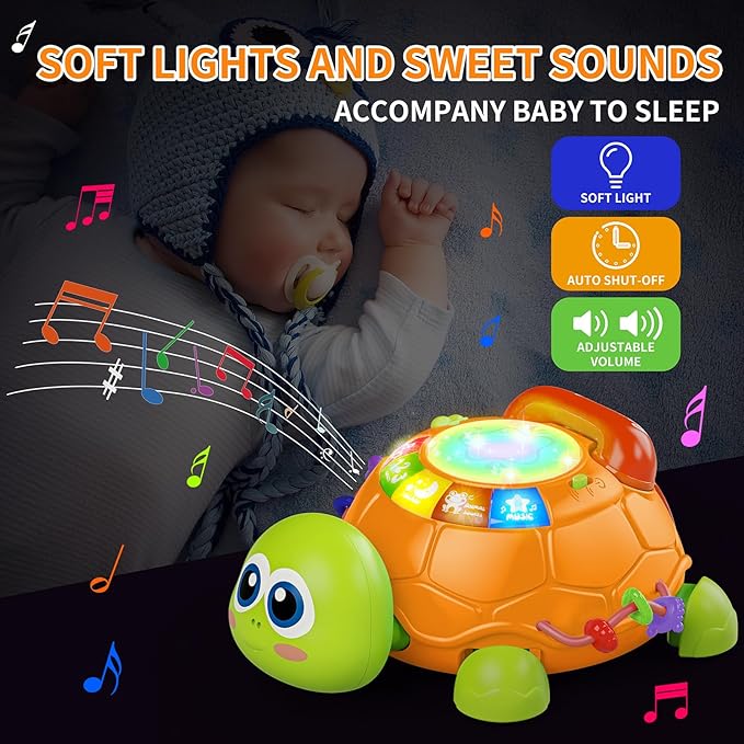 - Educational Baby Toys 6 to 12 Months:Press the tortoise button and the turtle will crawl forward with cheerful songs and lights, which can catch your baby's eyes and attract them to crawl or chase after it.The muscle strength/ motor skills/ hand-eye coordination/ limb coordination can also be developed as they play.On both sides of 6 month old baby toys are specially designed rotating beads to practice finger dexterity..Creative crawling toy for 12 to 18 months old babies.