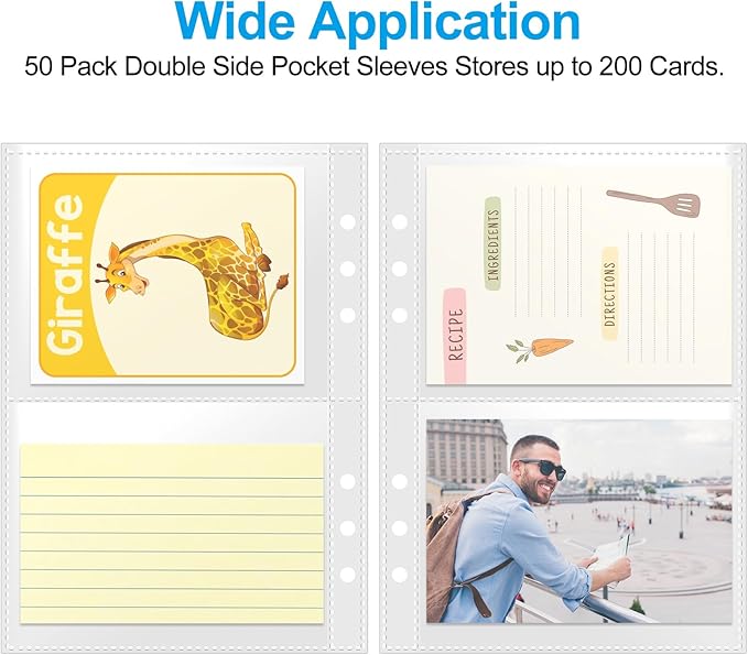 - MAXIMUM PROTECTION: With our 2-pocket page protector design, each card is securely held in place, preventing shifting and potential damage. Keep your cherished recipes, memorable photos, and essential flashcards in pristine condition, knowing they are well-protected from creases, tears, and spills