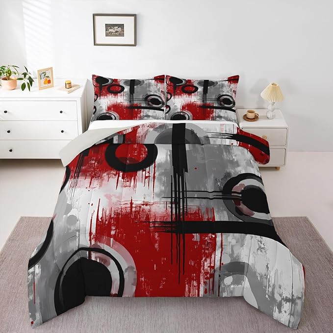 Feelyou Kids Abstract Comforter Set Twin Size Modern Art Bedding Set for Boys Girls Teens Bedroom Decor Geometric Comforter Women Men Geometric Red Black Duvet Set with 1 Pillow Case