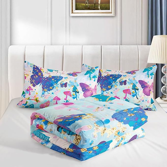Kids Comforter Set Colorful Butterfly Mushrooms Printed Pattern Bedding Set with 1 Comforter and 2 Pillowcases for Girls Boys Bedroom All Season(Butterfly Mushrooms Queen)