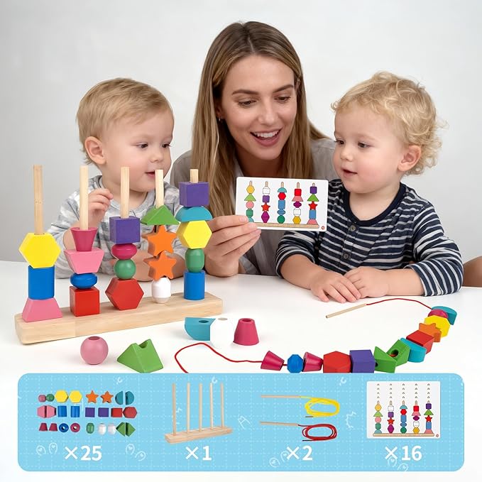 - All-in-One Montessori Learning Kit:Unleash a world of creative learning! This comprehensive toddler toy set for ages 2-4 includes a wooden stand, 25 colorful beads, 2 easy-thread laces, and 8 double-sided pattern cards. It combines stacking, lacing, sequencing, and shape matching in one toy, offering endless fun and foundational skill development.