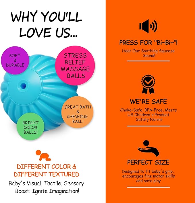 - Safe and Soothing: Made from high-quality, BPA-free and non-toxic materials, these sensory balls are gentle on delicate skin and safe for teething. Certified to meet U.S. toy safety standards and free of small parts, they offer worry-free playtime and comfort during every stage of baby’s development.