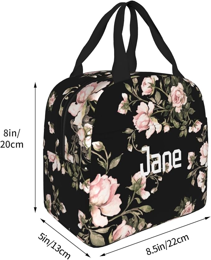 Custom Lunch Bag Watercolor Rose Pink Flower Black Personalized Insulated Lunch Box with Name Reusable Cooler Tote for Adults Student Girl Boy Work Office School Picnic Over 3 Years Old