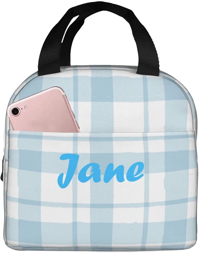 Custom Lunch Bag Plaid Blue Check Personalized Insulated Lunch Box with Name Reusable Cooler Tote for Adults Student Girl Boy Work Office School Picnic Over 3 Years Old