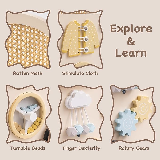 - Interactive Activity Center: One side features zippers, small buttons, and a simulated washing machine with rolling beads, while the other side includes a baby bottle and a plate. This helps children simulate caring for a baby while developing hand-eye coordination and other skills.