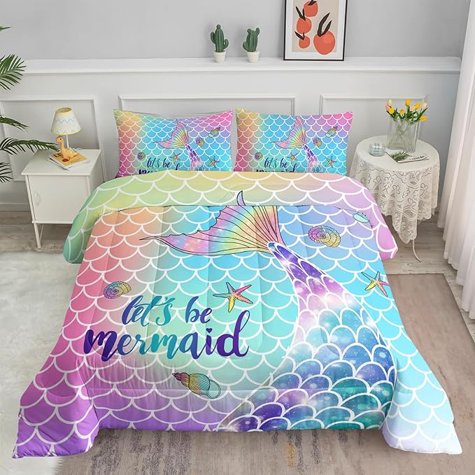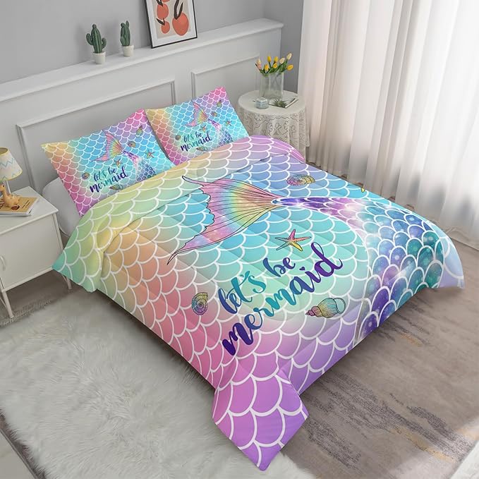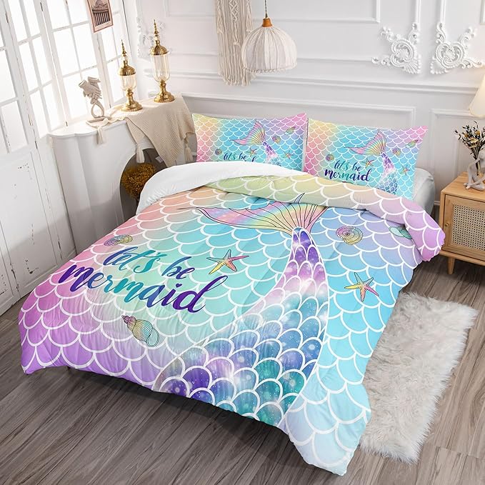 Mermaid Tail Comforter Set Rainbow Scales Printed Bedding Set with 1 Comforter and 2 Pillowcases for Boys and Girls Bedroom All Season(Mermaid Twin)