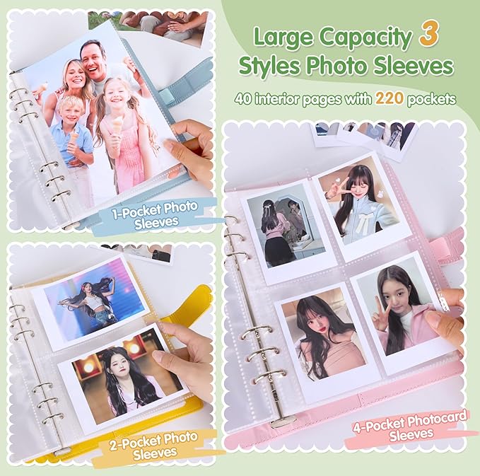 - Complete Storage Set: Includes 1 PU leather A5 binder, 20 double-sided 4-pocket card pages (160 pockets), 10 double-sided 2-pocket photo sleeves (40 pockets), and 10 double-sided photo sleeves (20 pockets), offering a total of 220 pockets for ultimate organization