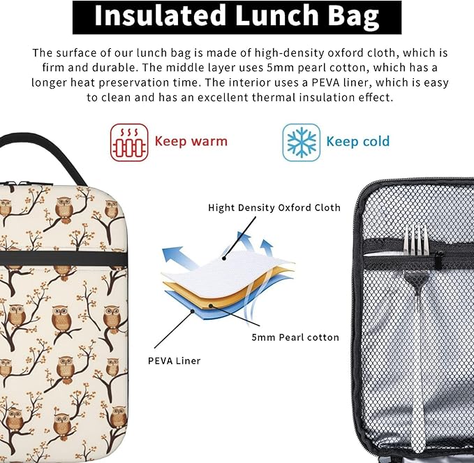 - Materials: The Owl lunch bag is made of high density Oxford cloth and heavy aluminum foil. 10 X 8x 4 inches keeps food hot/cold for hours, and our insulated lunch bags keep your food/drink at optimum temperature.