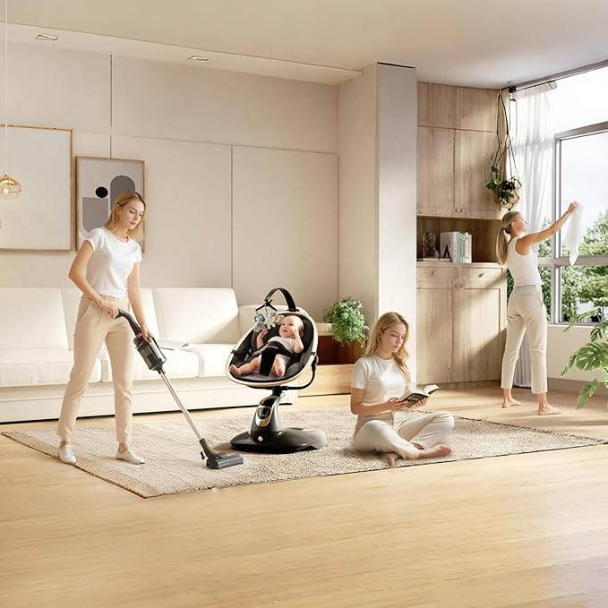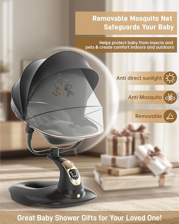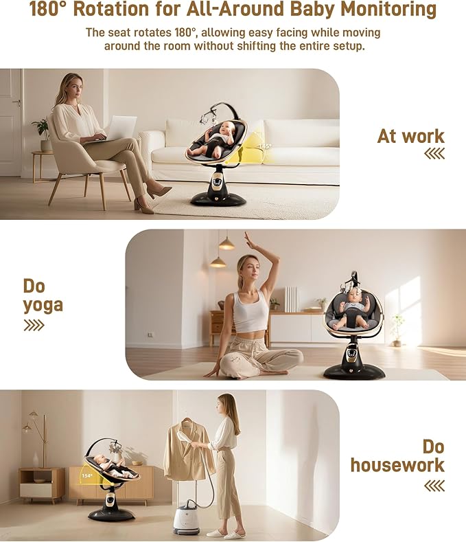 - Smart Control & 180° Rotation: Oneya baby electric baby swing for newborn is finished with 5- speeds for gen-tle rocking. Not only aids visual development but also safeguards brain health. Easily adjusted settings via touch panel, remote control, and Bluetooth. 180° Rotation: Let you face your child or save space instantly.