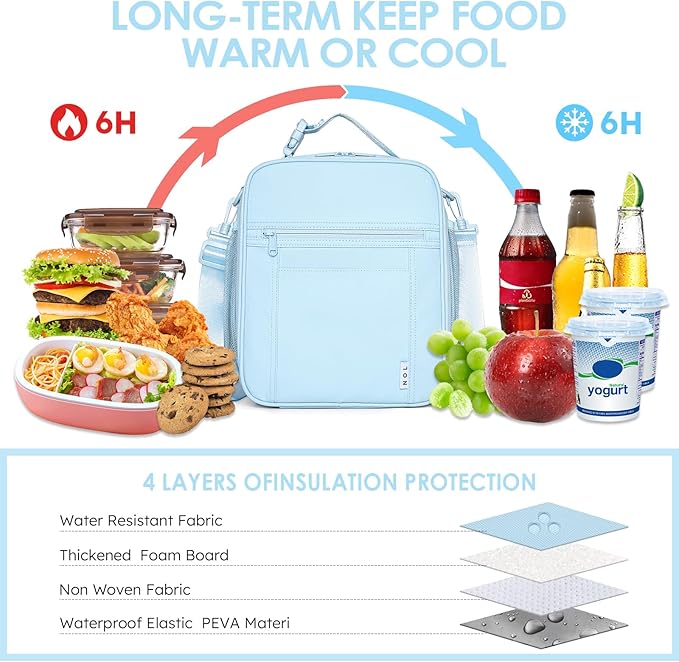 - Insulation & Freezing: NOL kids lunch bag adopts three-layer insulation design: the outer layer is made of 900D oxford cloth and polyester fiber, the middle layer is filled with 5mm thick insulation material, and the inner layer is made of eco-friendly PEVA material, which provide great insulation to keep the food warm or fresh up to 5 hours. The NOL insulated lunch bag is an ideal choice for daily outings.