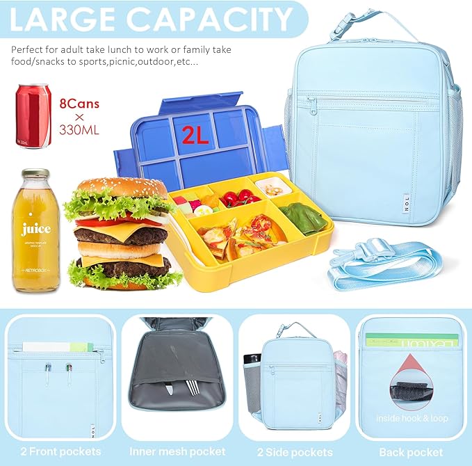 - Ample Storage: The main compartment is designed with NOL double zippers and spacious interior, comes with zippered mesh inner pockets for lunch boxes, fruits, snacks, drinks, bread, utensils and more. There is also a zippered compartment and spacious front pocket for small items such as keys and tissues. There are two side mesh pockets for drinks, umbrellas, or water bottles, meeting your daily dining needs.