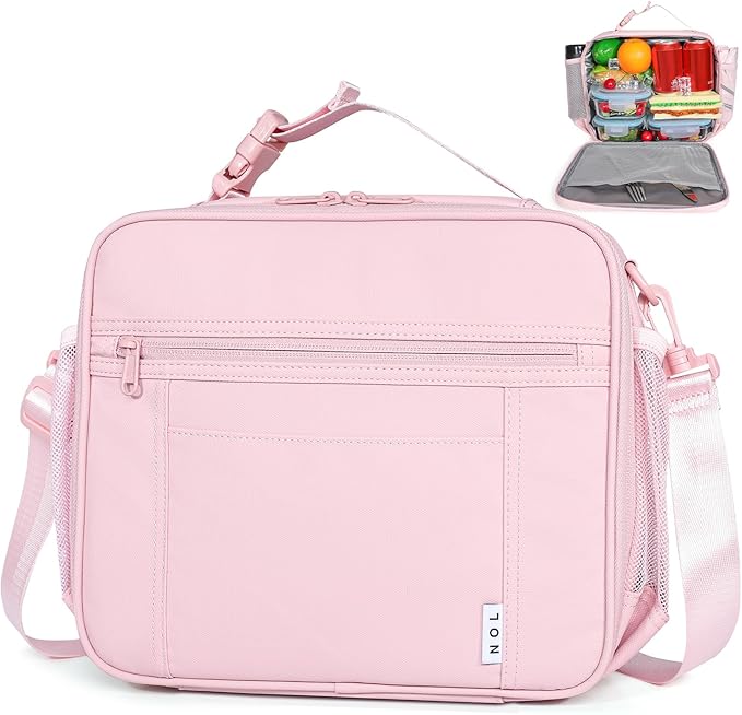 NOL Kids Lunch Bag - Kids 3+ Reusable Insulated Lunch Box with Zipper Closure Buckle Handle Adjustable Long Shoulder Strap, Easy-Clean Waterproof Fabric, Children Lunch Tote Bag for School -Pink