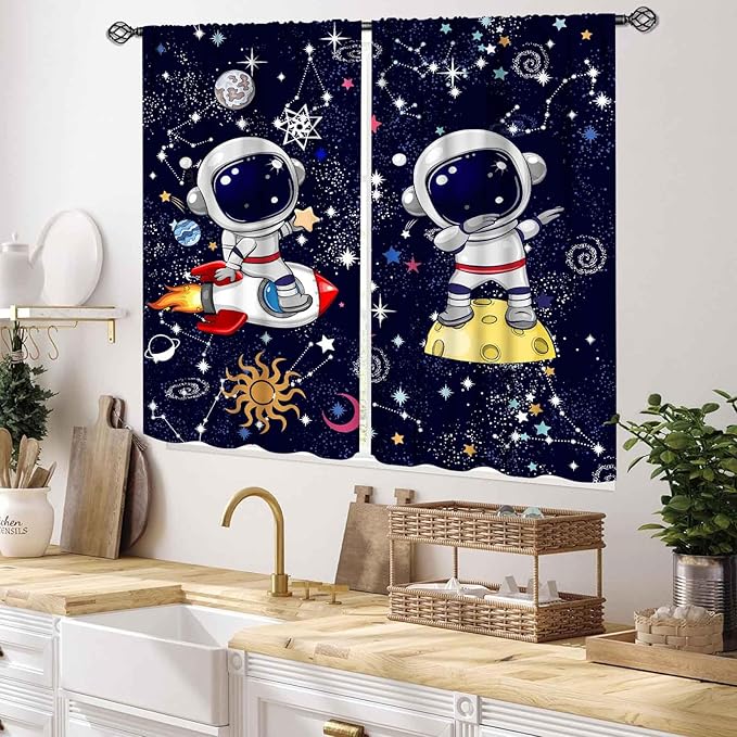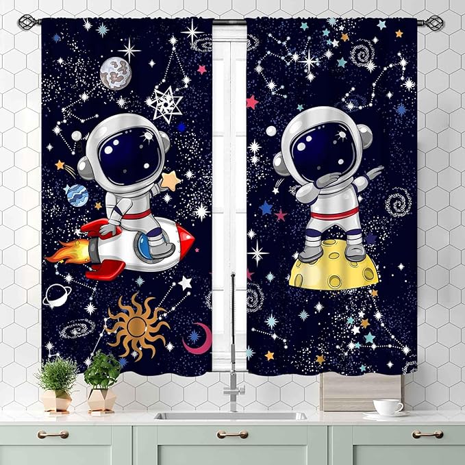 Galaxy Curtains, Cartoon Astronaut Universe Outer Space Star Planets Blackout Window Drapery Treatments for Kids Boys Bedroom Living Room Nursery Playroom 2 Panels, 55x39 Inch