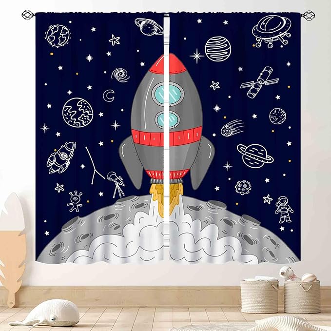 Kids Space Curtains for Boys Room, Cartoon Rocket Universe Galaxy Space Planets Navy Blackout Kids Window Drapery Treatments for Bedroom Living Room Nursery Playroom 2 Panels, 84"x63" Inch