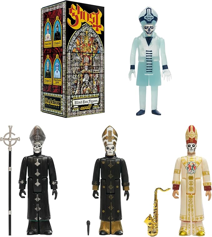 - GHOST SUPER7 ACTION FIGURE: A blind box set of Ghost figures, inspired by the many guises of the lead singer of the Swedish rock band, joins the Super7 action toy figures lineup