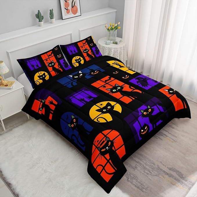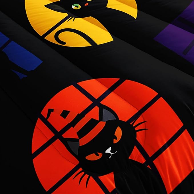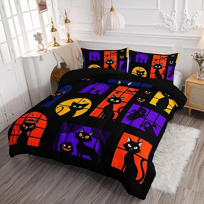 Black Cat Comforter Set Cute Animal Printed Bedding Set with 1 Comforter and 2 Pillowcases for Boys and Girls Bedroom All Season(Cat-2 Full)