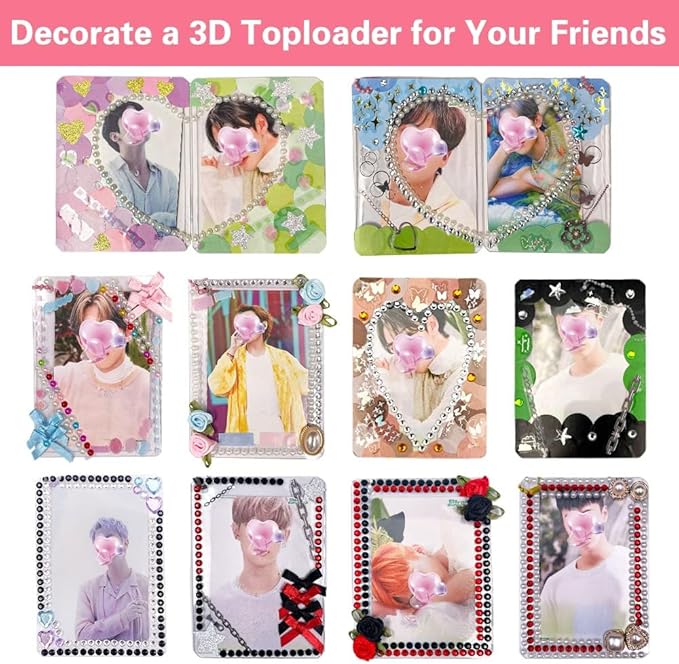 - One Card, One Touch – Comes with 10 durable hard card sleeves, K-pop style stickers, pearl decals, rhinestones, 3D elements, and glue dots. Everything you need to create dreamy, idol-inspired card designs full of personality and sparkle.