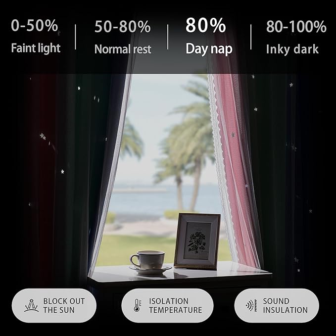 - GIFT FOR LIFE: Curtain keeps out just the right amount of light so you or your child can sleep in peace. The colors are so pleasant to look at, and the sun comes through the little stars and makes the room sparkle, these make the room look just magical. This will bring a little beauty to your life.