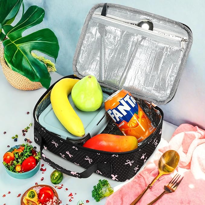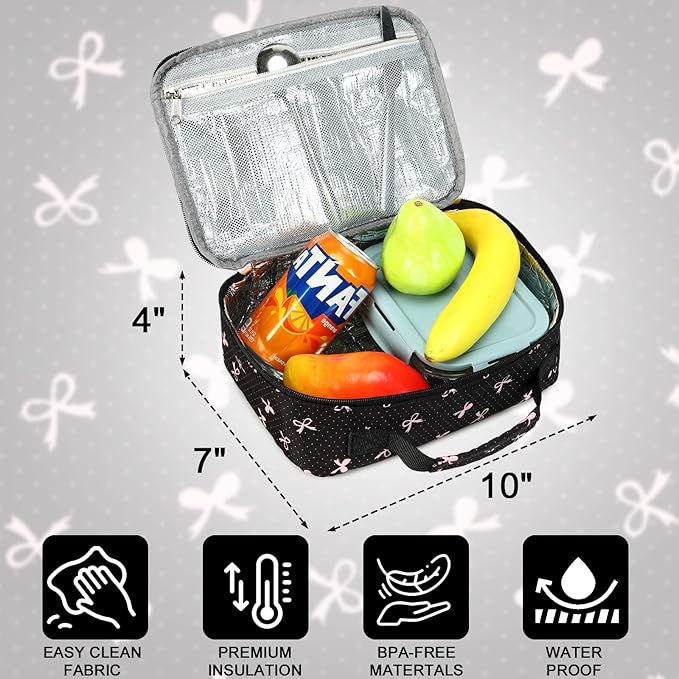 - Good Insulation: bow lunch box is ideal for kids girls for a school day. It’s made of waterproof Polyester material, insulation is thick aluminum foil liner, Excellent fresh-keeping effect with an ice pack ensures you enjoy your fresh food and drink anywhere