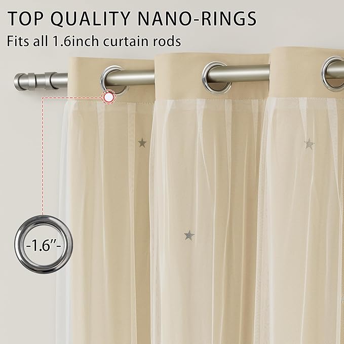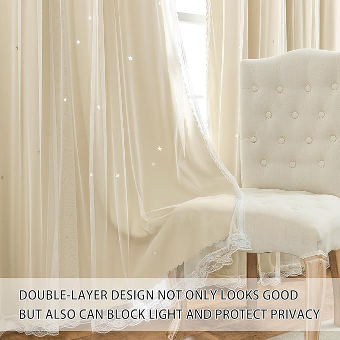 XiDi Beige Curtains with Sheer Overlay for Living Room Bedroom Small Window 2 Panels 80% Blackout Double Layer Star Curtains for Kids Girls Room Darkening Grommet Drapes with Tiebacks W34 X L45
