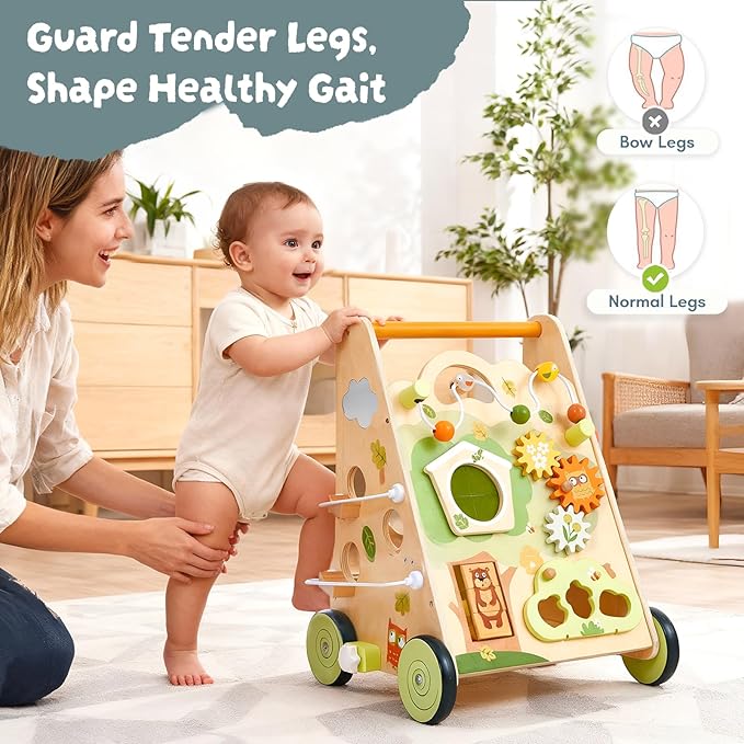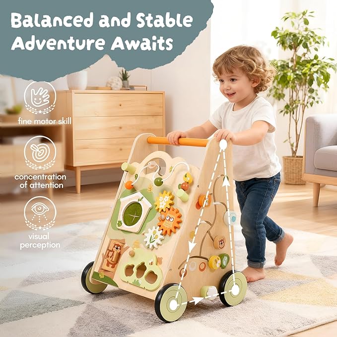 Wooden Baby Walker with Activity Center, Forest Themed Montessori Push Toy for Toddlers 1–3, Bead Maze, Shape Sorter, Gears, Puzzles & Fine-Motor Learning, Speed Adjustable Wood Walker for First Steps