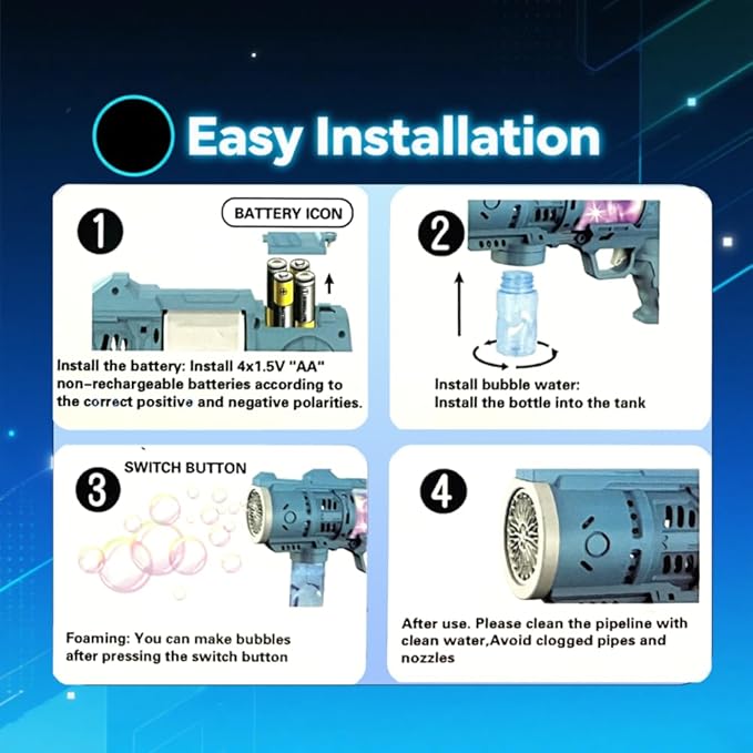 - MORE DURABLE BUBBLE GUNS:The Bubble Machine Gun for Kids Ages 4-8, Use High-Grade Environmentally Friendly Materials.Easy to Use. Easy Attach.360° Leak-Proof Design to Prevent Bubble Liquid from Leaking Onto your Hands when Running and Jumping,Creating a Dazzling Spectacle for Endless Enjoyment. Experience Durability and Reliability with Bubble Gun.(Batteries Not Included)