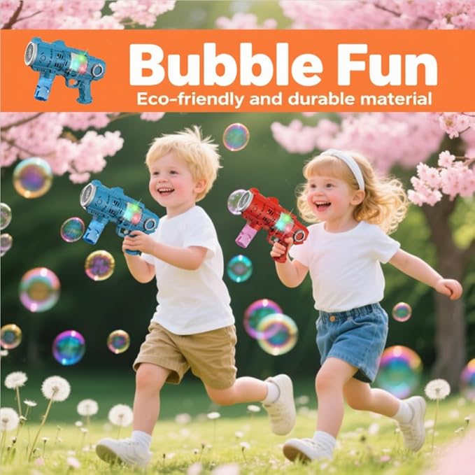 - MORE DURABLE BUBBLE GUNS:The Bubble Machine Gun for Kids Ages 4-8, Use High-Grade Environmentally Friendly Materials.Easy to Use. Easy Attach.360° Leak-Proof Design to Prevent Bubble Liquid from Leaking Onto your Hands when Running and Jumping,Creating a Dazzling Spectacle for Endless Enjoyment. Experience Durability and Reliability with Bubble Gun.(Batteries Not Included)
