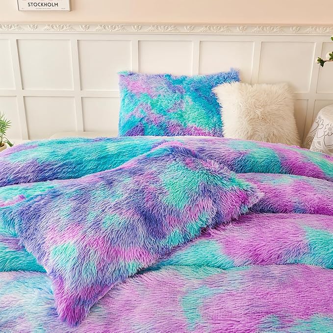 PERFEMET Fuzzy Girls Twin Comforter Set 3 Pieces Colorful Purple and Teal Faux Fur Fluffy Bedding for Kids Teens Ultra Soft Warm Tie Dye Velvet Plush Shaggy Bed Comforter Sets(Purple Teal, Twin)