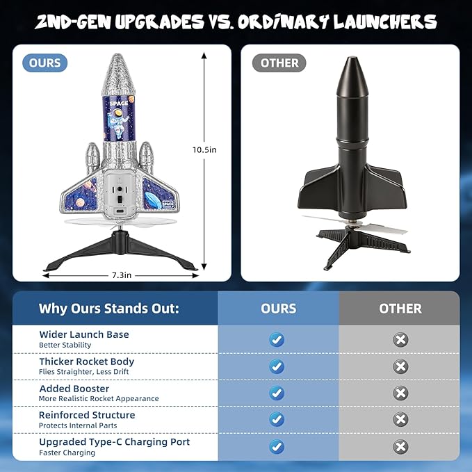 - 2025 Upgraded Rocket Toy: This is 2025 upgraded rocket launcher for kids, our rocket launcher features a more powerful booster for enhanced stability during both flight and landing.This toy rocket highly replicates the rocket launch scenarios, allowing kids to get in touch with basic physics knowledge, such as how propellers and parachutes work. Let children discover STEM knowledge through hands-on practice and experience thrilling outdoor games. They'll definitely love it!