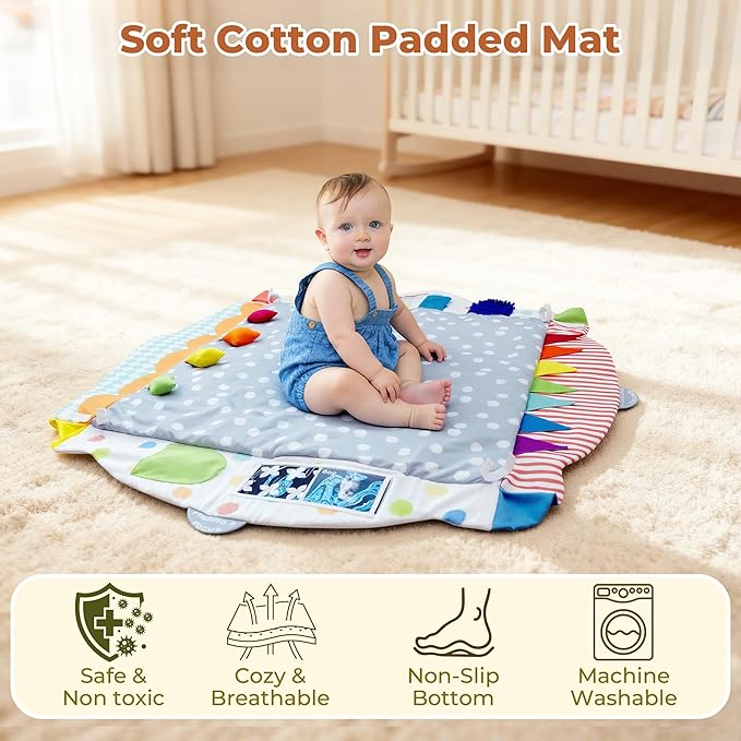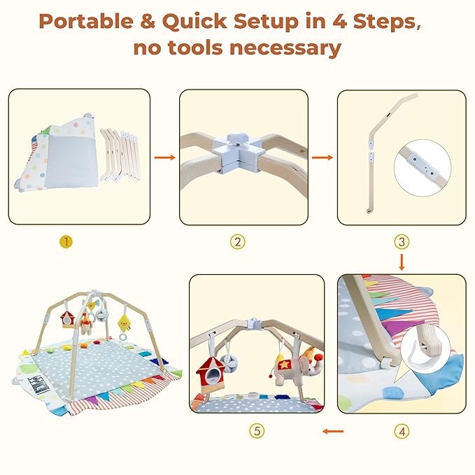 - π§Ό Easy Setup & Care - Effortless assemble in 2 minutes without tools! Lightweight and portable for travel or storage. The playmat and developmental accessories are machine washable in cold water for easy cleaning and baby-safe play. Wooden and plastic parts wipe clean with a damp cloth for hassle-free maintenance