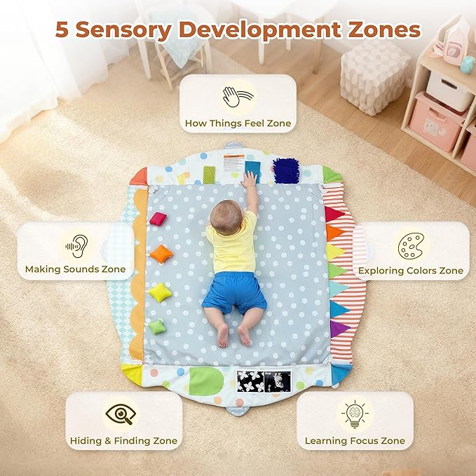- π Multipurpose Baby Gym Center - Our infant activity gym features 5 Montessori-inspired developmental zones (Touch, Color, Sound, Curiosity, Hide & Seek) to spark exploration and growth. It engages your babyβs senses of sight, hearing, and touch to boost sensory awareness, improve body and hand-eye coordination, and support early cognitive skills