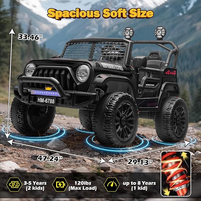 - 【PARENT REMOTE & MANUAL MODE】 This kids ride-on car includes a convenient parent remote control, allowing adults to take full command of the electric vehicle. It features three adjustable speeds (3.11-3.9- 4.97 mph), along with an emergency parking function for added safety. Join the adventure and enjoy a wild ride with your child—all while maintaining complete control.