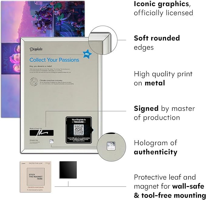 - Hassle-Free Mounting – No Frame, No Hassle : Forget tools and nails! Each Displate features a simple magnet mounting system that’s damage-free and easy to install. This wall decor is ready to hang in minutes, making it a must-have for anyone looking to upgrade their room decor quickly and effortlessly.
