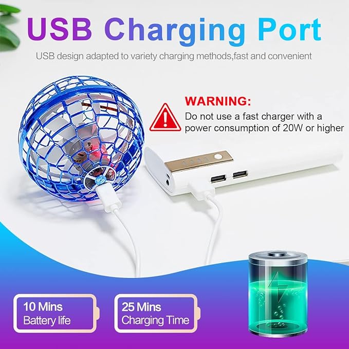 - Endless Fun with Hover Ball:Experience uninterrupted fun with USB Charging feature of this flying orb ball.Achieve a full charge in just 20 minutes and enjoy 8-10 minutes of continuous flightIt supports versatile charging options,including computers,power adapters, mobile phones,and portable chargers.The indicator light provides real-time charging status updates, ensuring you're always ready for the next adventure