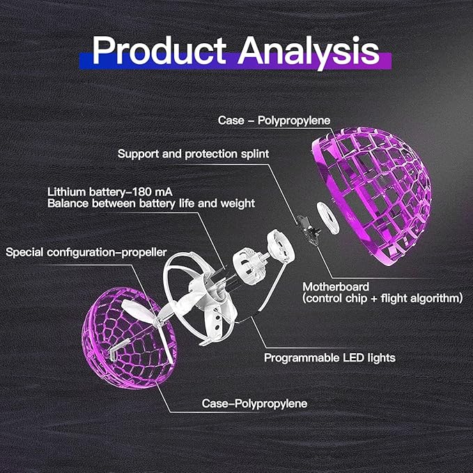 - High-Tech Hand Controlled Drone Toy With Cool RGB Light: The flying orb toy provides intelligent flight. Different throwing angles and speeds will create different flight lines and boomerang effect.You can use your ingenuity to create your unique way of playing.The colorful led at night will make your magic ball cooler