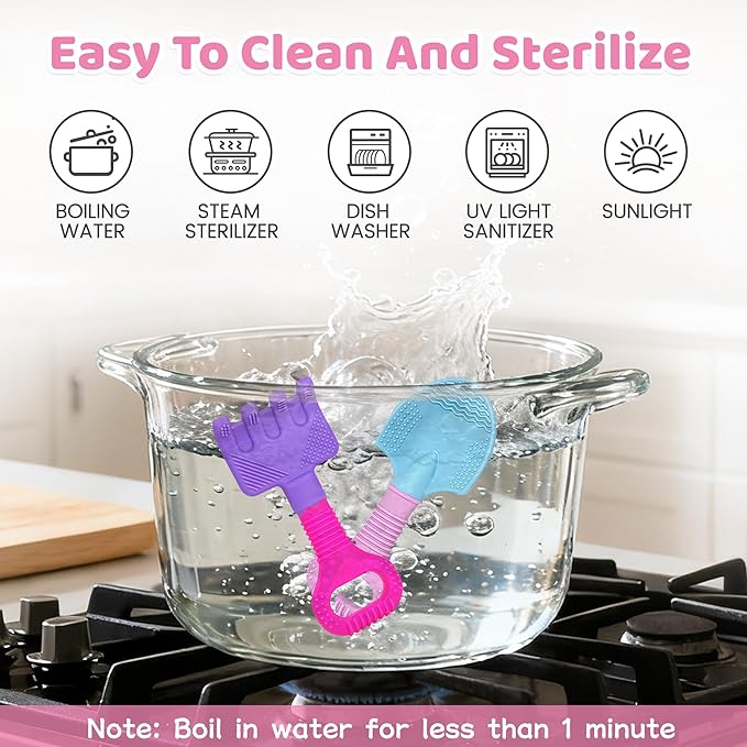 - đ§ ăEasy-Clean & Parent-Approvedă: These baby teething relief are dishwasher-safe for effortless cleaning, and can also be quickly rinsed with a simple hand wash. These baby essentials teether toys for thorough sterilization, boiling or steaming works perfectly. Always ready for safe, on-the-go chewing!