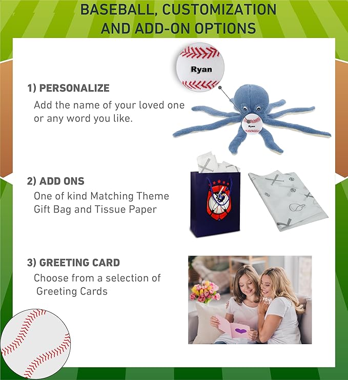 - Personalization, Customization, and Add-On Options - The Super Soft Sports Stuffed Animal Blue Octopus comes customized with a small baseball plush. You can personalize your stuffed animal octopus with the name of your loved one which we will imprint on the item. You also have the option to add some or all of the cool add-ons to make your gift extra special: 1) Gift Bag; 2) Tissue Paper; 3) Greeting Card.