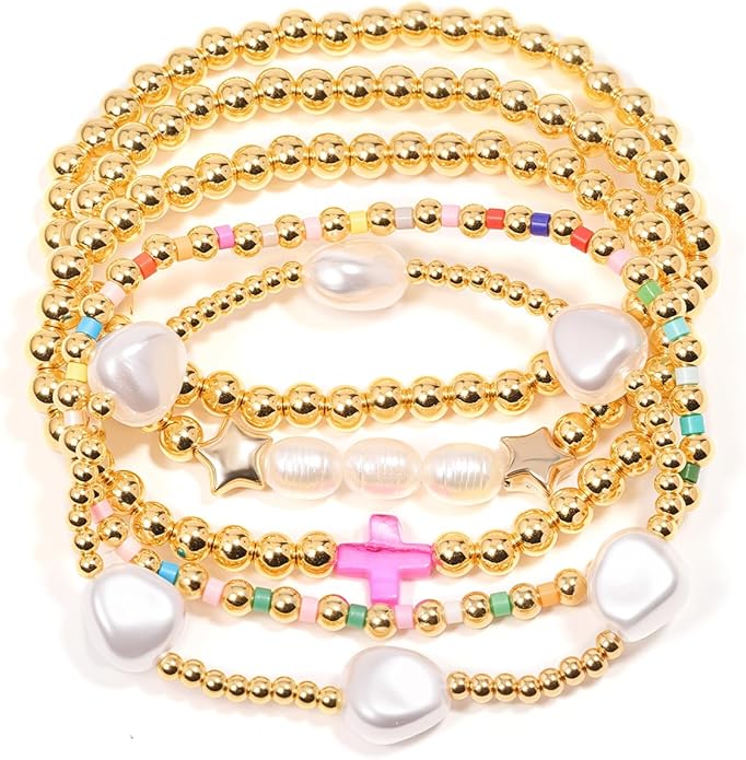 AICase for Korea-Pop Christian Gold Bracelets 5 Pcs Stackable Stretch Friendship Beaded Pearl Cross Bracelets k pop Costume Trendy Jewelry Gifts for Fans Women Birthday Christmas Stocking_63