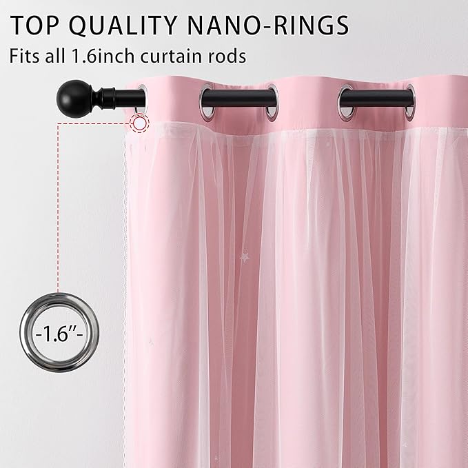 - PACKAGE INFORMATION: The package include 2 panels of double layer star cut-out curtains and 2 free tiebacks. Grommets top(1.6 inch inner diameter), each curtain measures 52 inches wide, 45 inches long.